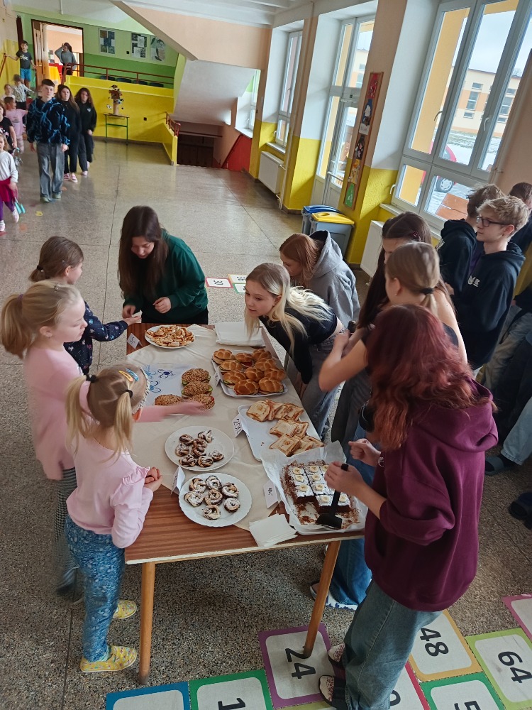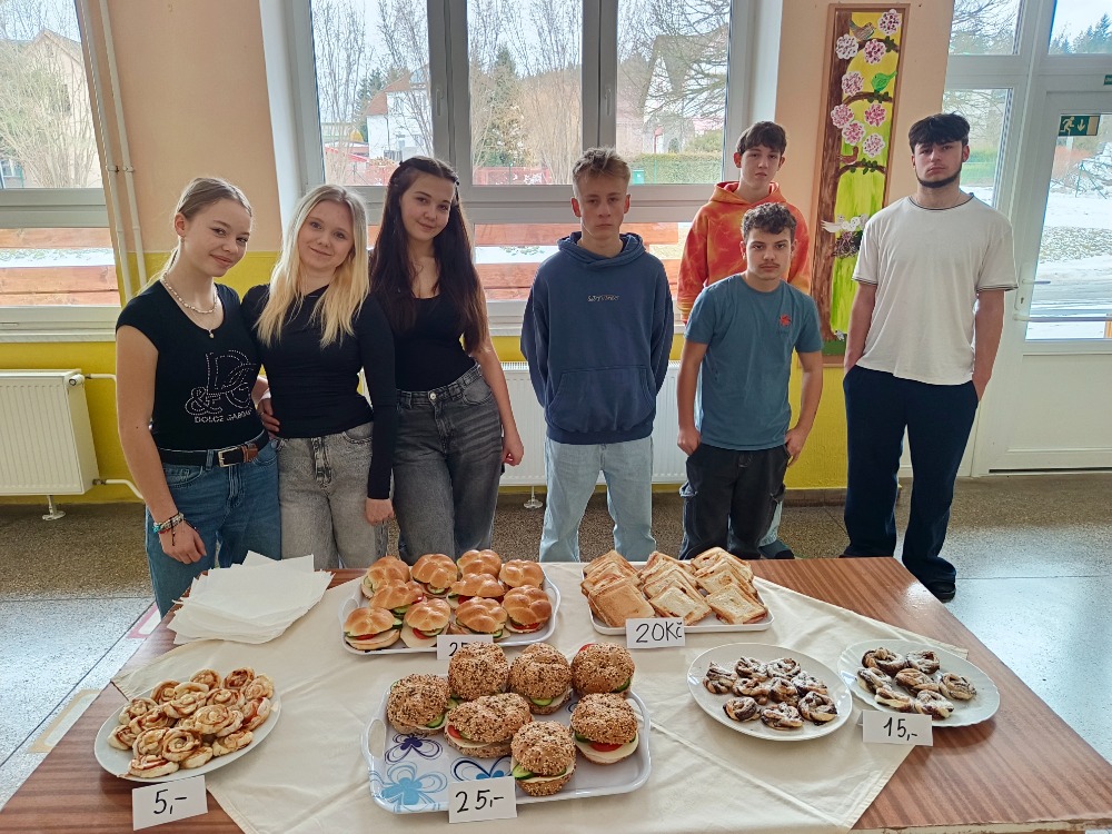 Třída 9.B připravila pro ostatní spolužáky svačinku. V nabídce byla banánová buchta, slané šneci, sladké šneci, obložené housky, toasty.