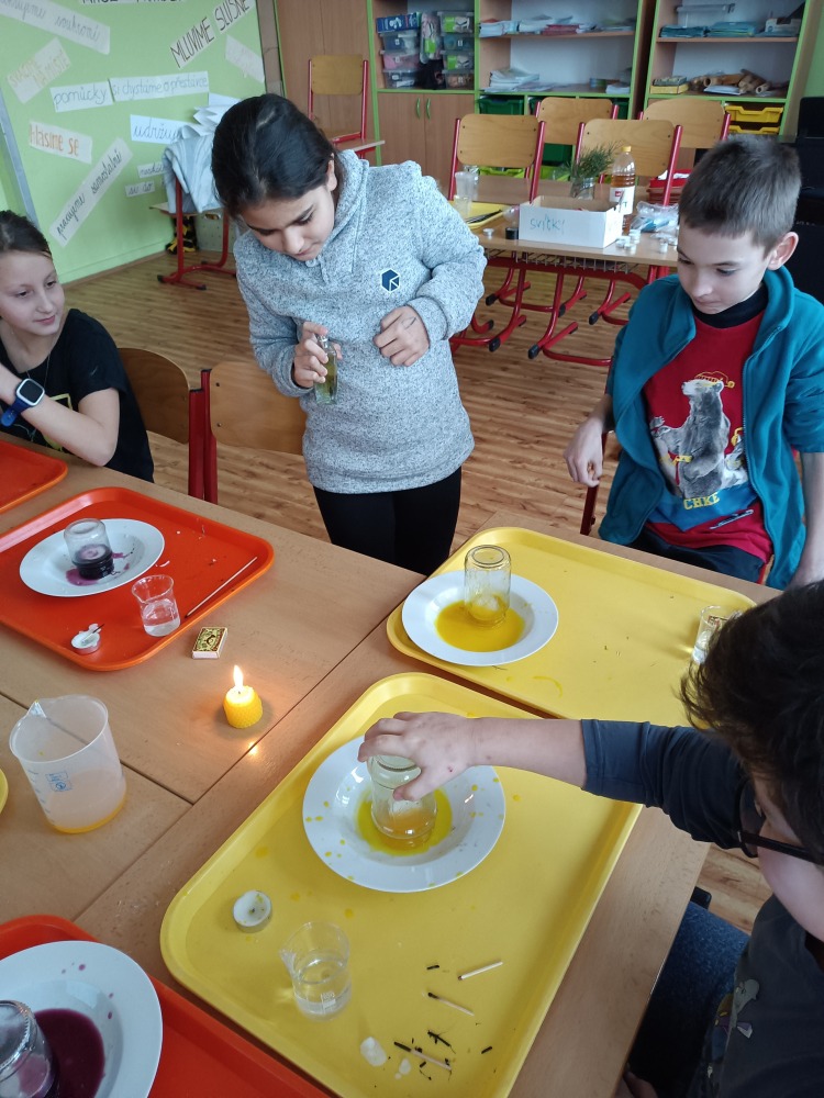 Na další schůzce zkoumali s použitím bílku, která chemická látka dokáže nejlépe zničit škodlivé viry. Využili k tomu i názornou demonstrační pomůcku vyrobenou žáky 2. stupně.