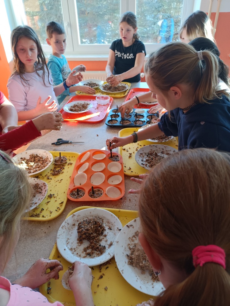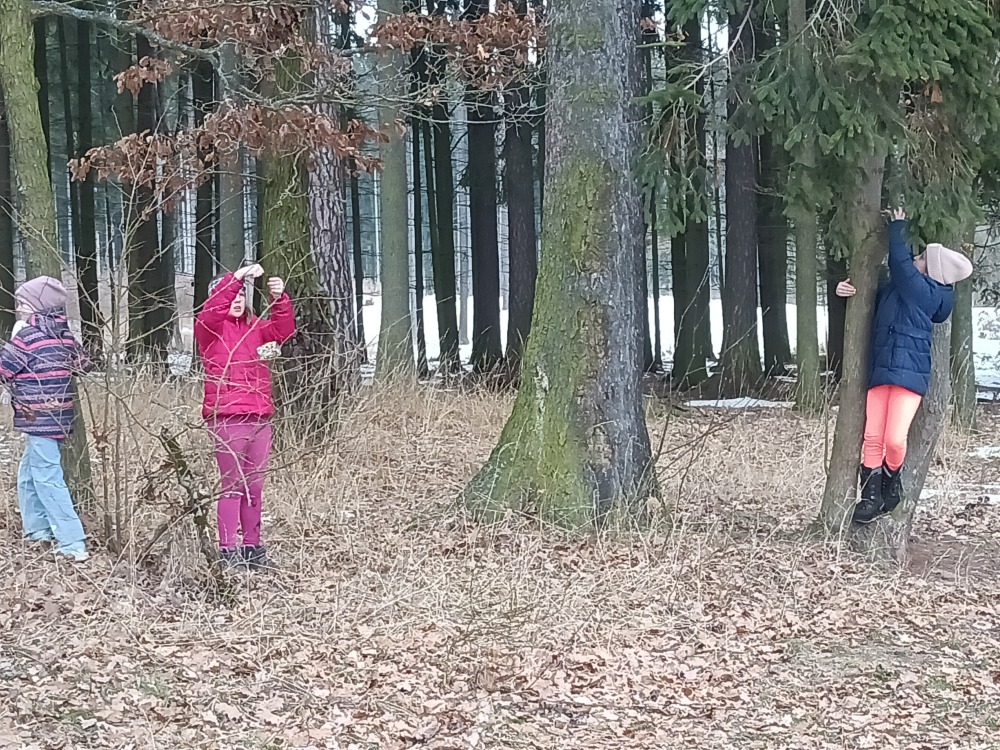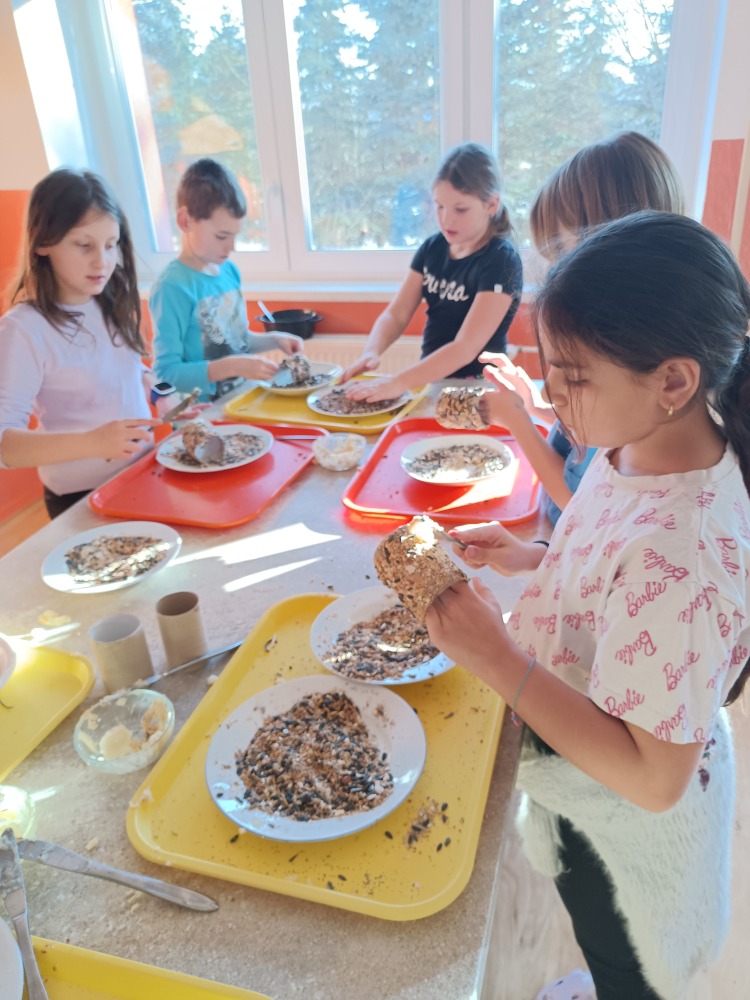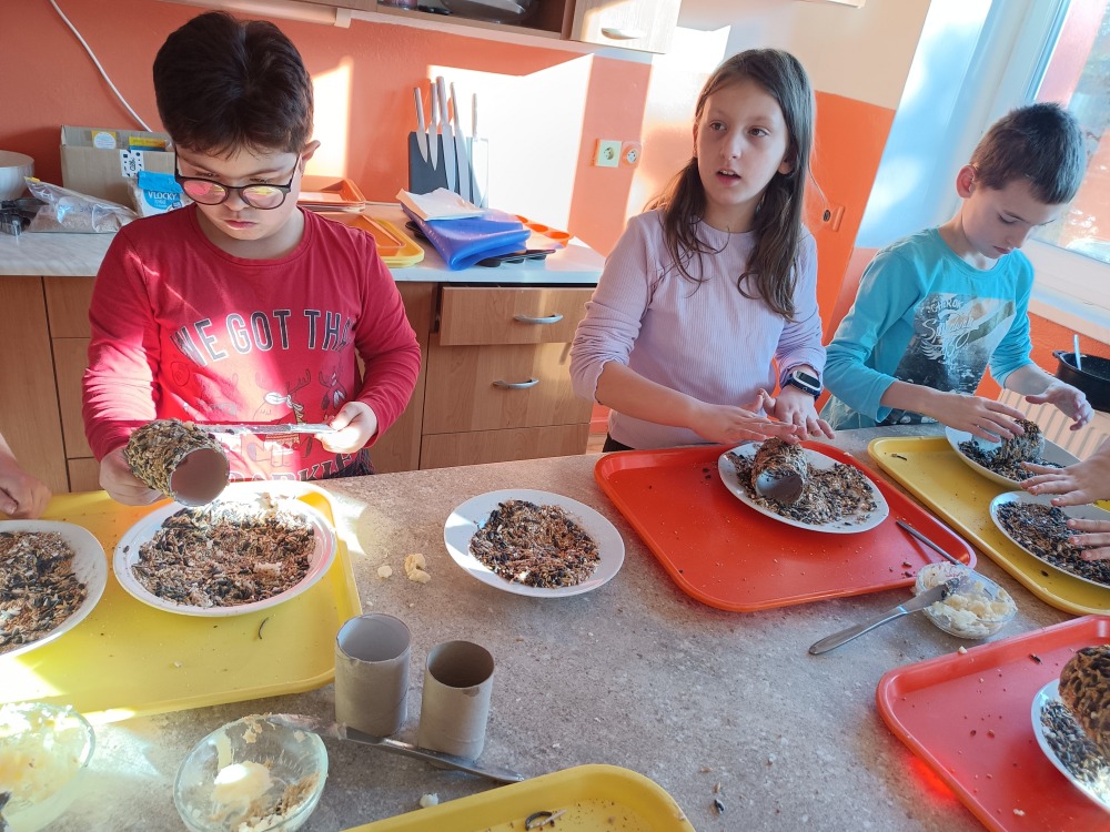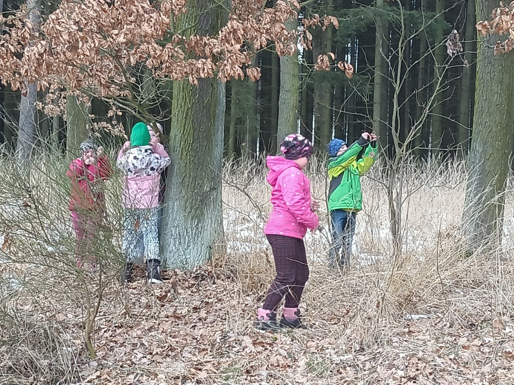 Pro ptáčky strádající v letošní nevlídné zimě připravily děti malá závěsná krmítka, která u lesa navázaly na větvičky, aby si na nich ptáčci pochutnali.