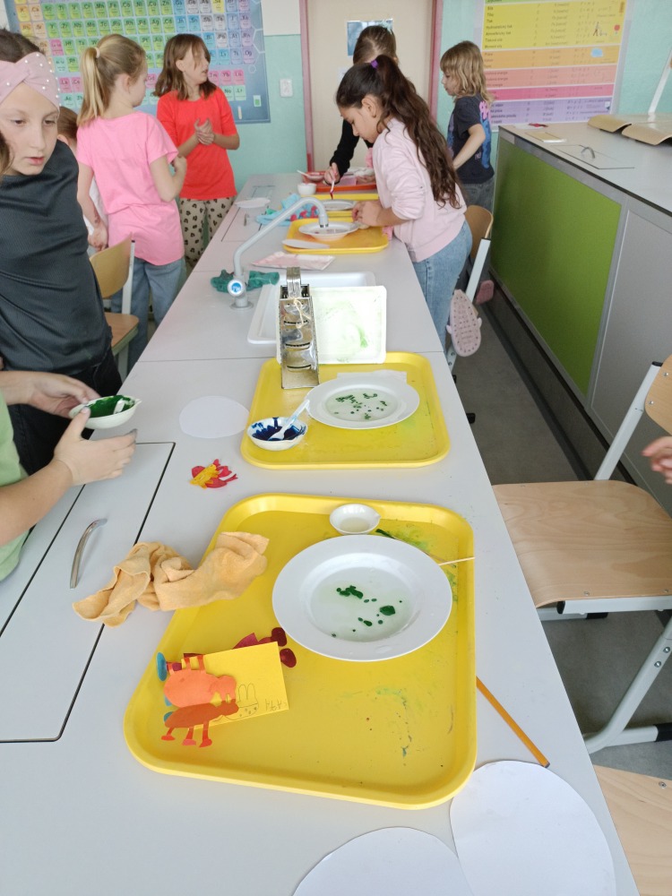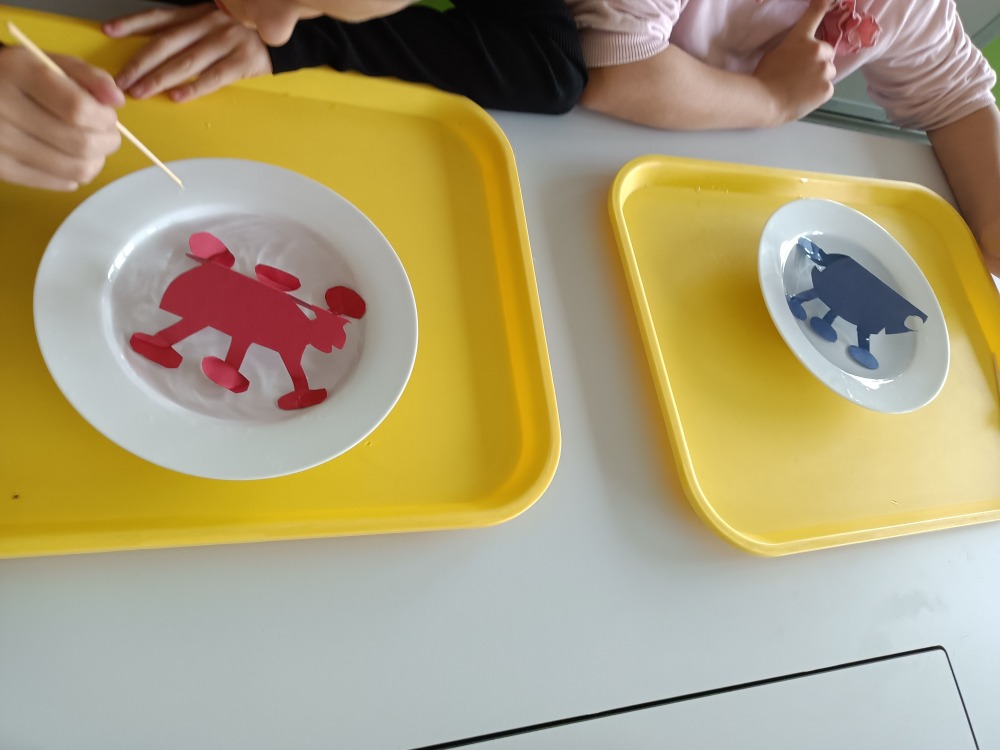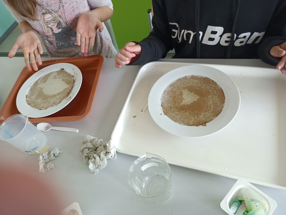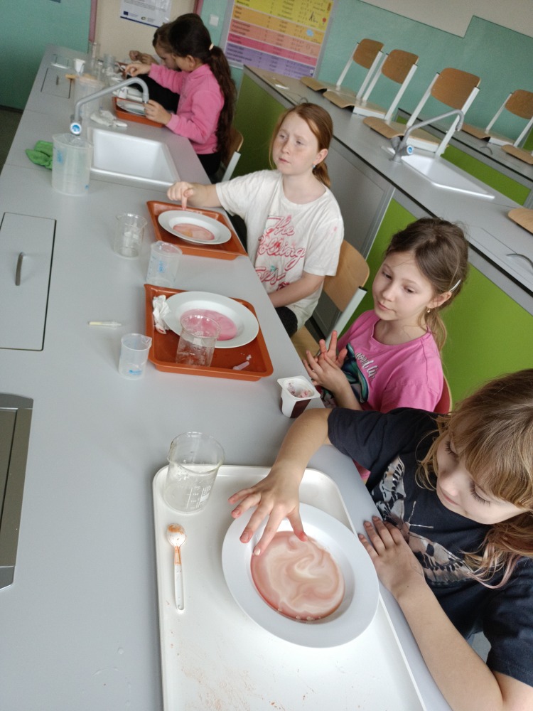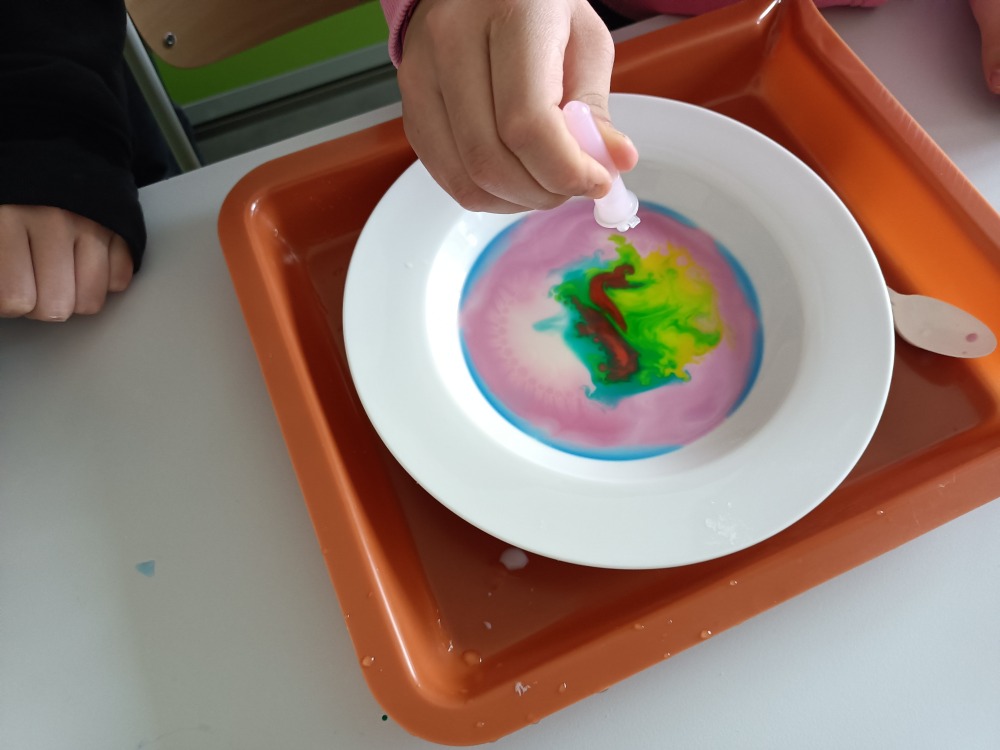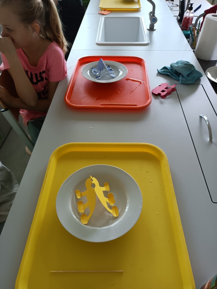 Učili plavat jehlu na hladině vody, zkoušeli, jak se udrží na vodě jejich papíroví brouci, dozvěděli se, jak to mají s chůzí po vodě vodní brouci a jejich trik si také vyzkoušeli. Hráli si s barvičkami i s pepřem, aby vypozorovali, jakým způsobem povrchové napětí naruší saponáty. Práce s barvičkami je bavila, stejně jako drcení křídy v hmoždíři, když si vyráběli barvičky na mramorování papírových kraslic.