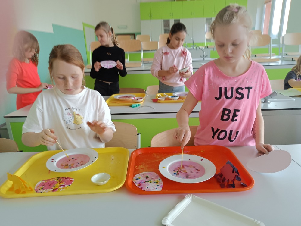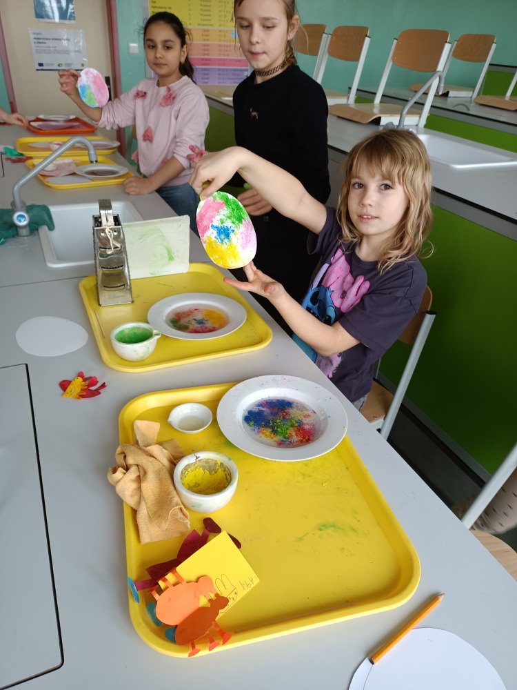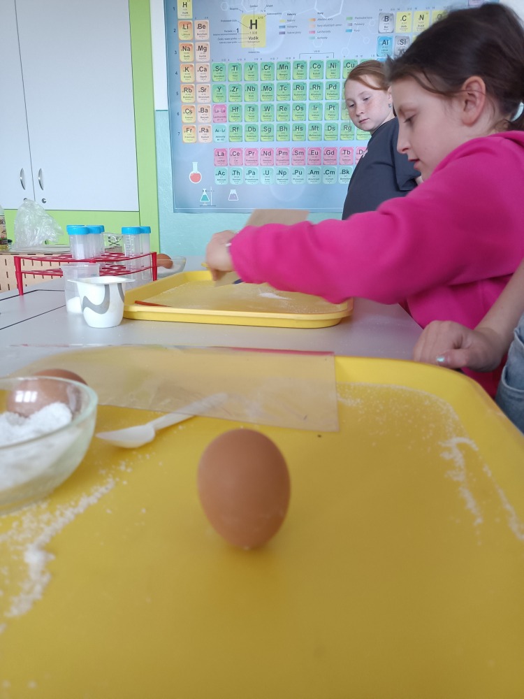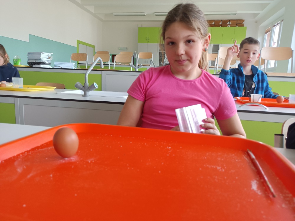 Předvelikonoční odpoledne dělali pokusy s vajíčky: zjistili, jak se pozná bez rozbití vařené vejce od syrového, zkažené od čerstvého. Učili vajíčko plavat ve vodě, to musili upravit vodu tak, aby se celé vejce udrželo na hladině. Zkoušeli pevnost vajíčka a překvapilo je, že ho v dlani nedokáží rozbít. Dokázali byste odhadnout, jakou váhovou zátěž vajíčko snese? To jejich na sobě udrželo bez rozbití téměř 10 kg! Nakonec si vyzkoušeli ještě zdobení ubrouskovou technikou s použitím nasyceného cukerného roztoku.