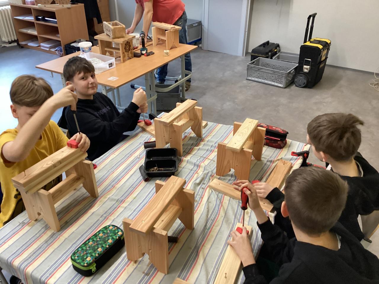 Žáci 5. třídy si vyzkoušeli práci opravdových řemeslníků. Pod vedením zkušeného truhláře pana Petra Kaněry se pustili do výroby dřevěných stoliček – a nutno říct, že si vedli skvěle.