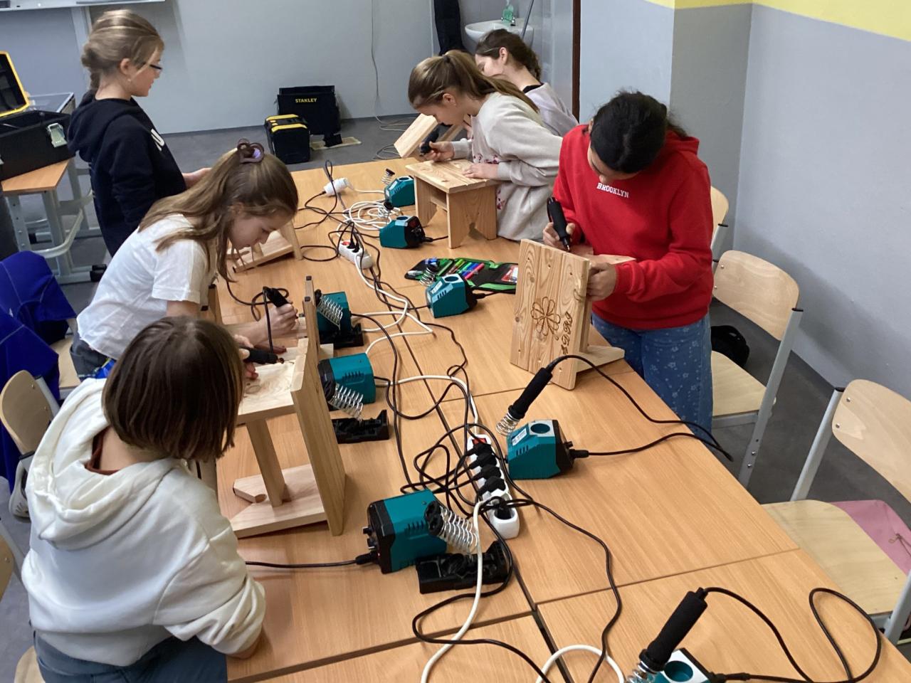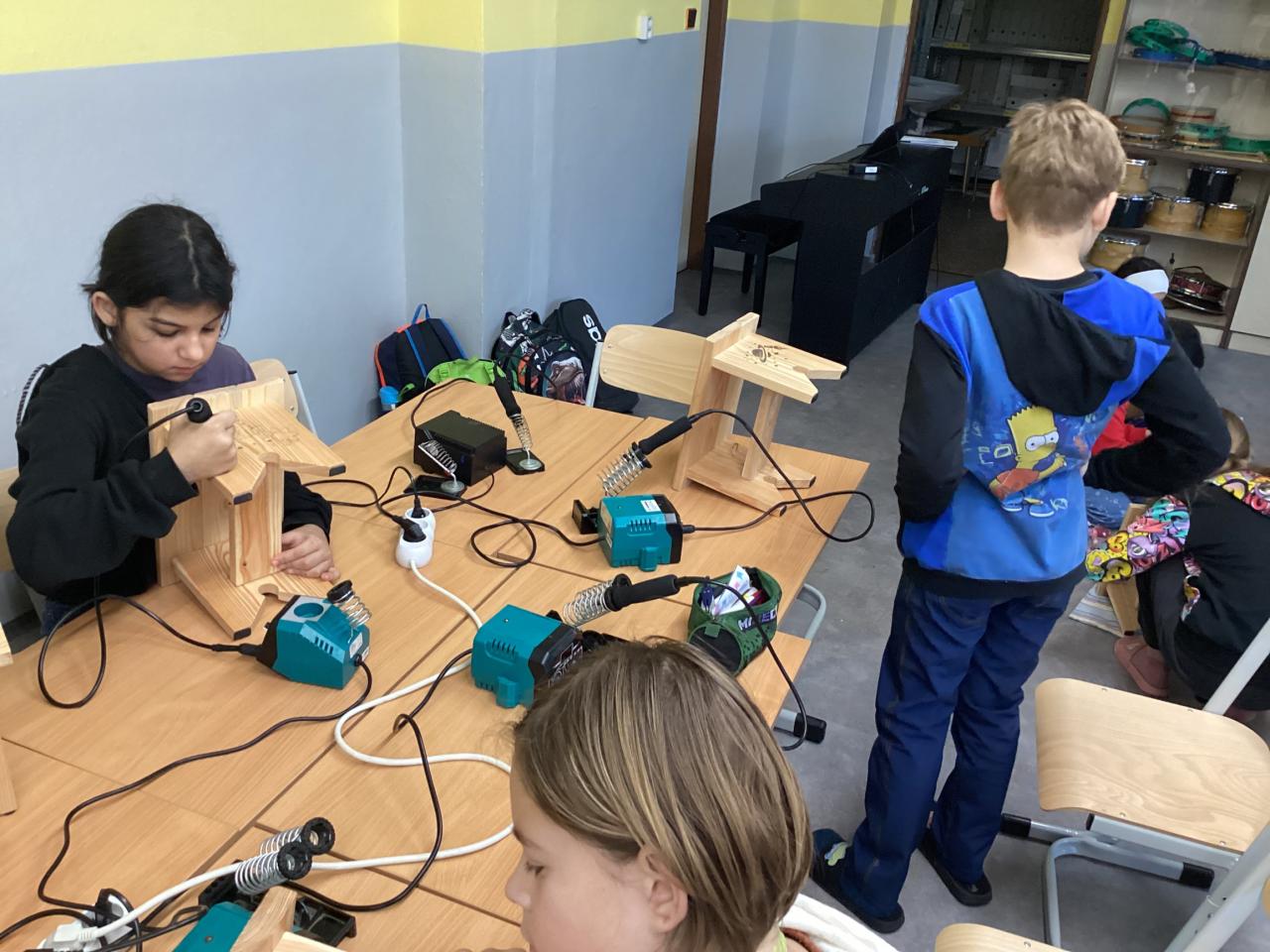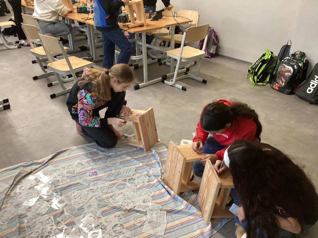 Své výrobky si děti navíc kreativně ozdobily – některé zvolily pájení ornamentů do dřeva, jiné dekorování akrylovými fixy. Každá stolička je tak originál.